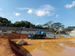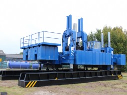 De langsliggers bevatten een railsconstructie waardoor het basisframe in lengterichting boven de dwarsliggers heen en weer kan bewegen. Daarmee manoeuvreert de machine van paal- tot paalpositie. Gestempeld op de twee tussensteunen komen de langsliggers vrij van de grond en kan de machine ook in dwarsrichting bewegen en kunnen de langsliggers ten opzichte van het basisframe in lengterichting verzet worden. Met het afwisselend stempelen op de langsliggers en de tussensteunen kan de machine op de projectlocatie “rondwandelen”. Bekijk hier een filmpje van T-Works dat meer inzicht geeft in de opbouw van de machine en het bewegen.